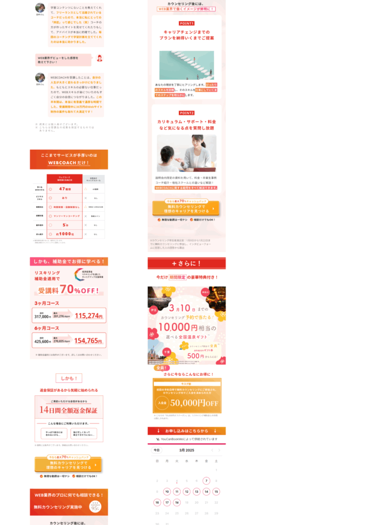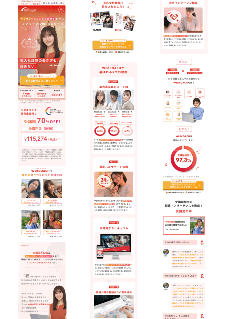 ランディングページ制作 2025年7月14日 最終更新日時 : 2025年7月14日 narusan-r 【製作時間】20時間【使用ソフト】Photoshop・illustrator・Figma・HTML・CSS・jquery【担当業務】デザイン・実装【意識した亊】スクロール離脱を防ぐためjqueryで動きをつけたLPを作成しました。